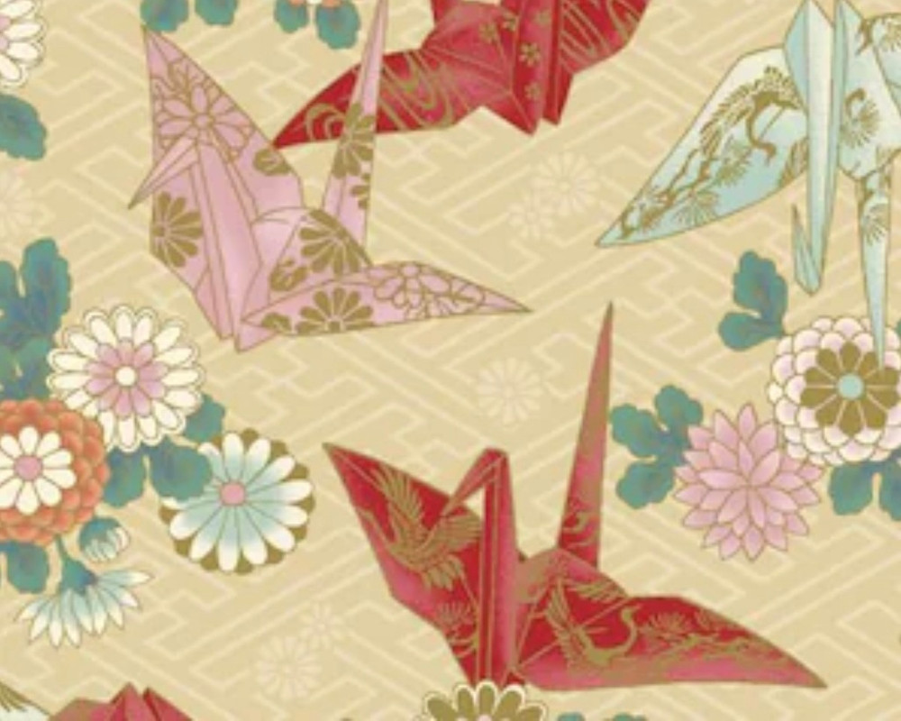 Click the button below to add the Hyakka Ryokan Kakuju - Paper Cranes Cream Metallic from Quilt Gate Fabric to your wish list.